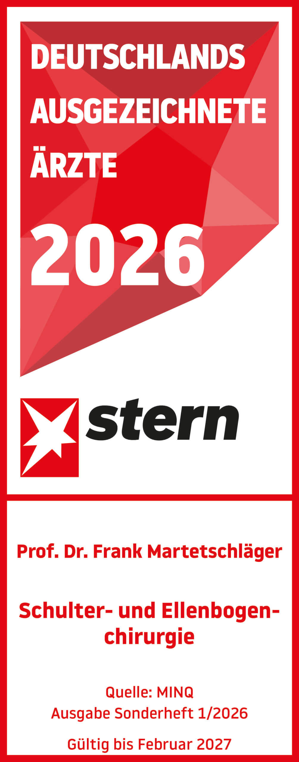 Prof. Dr. Frank Martetschläger gehört national wie international zu den führenden Spezialisten auf dem Gebiet und versorgt das gesamte Spektrum der modernen Schulter- und Ellenbogenchirurgie. Im Rahmen seiner Facharztausbildung hat Prof. Dr. Frank Martetschläger ein Jahr mit dem Schulterspezialisten Dr. Peter Millett an der renommierten „Steadman-Hawkins Clinic“ (The Steadman Clinic) in Vail, CO, USA gearbeitet und auf dem Gebiet der Schulterchirurgie geforscht.
