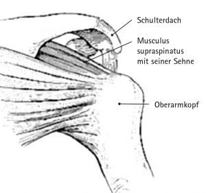 Unter dem Begriff Impingement-Syndrom versteht man die Zusammenfassung unterschiedlicher Ursachen, welche das Gleiten der Supraspinatussehne unter dem Schulterdach behindern. Ursache der Gleitbehinderung ist z.B. eine Formveränderung des Schulterdaches, die angeboren oder erworben sein kann. Auch Knochenausziehungen am Schultereckgelenk (Acromioclaviculargelenk, kurz: AC-Gelenk) als Ausdruck einer Schultereckgelenks-Arthrose können zu einer Einengung des subacromialen Raumes und somit zur Gleitbehinderung der Supraspinatussehne führen. Das ständige Reiben der Sehne gegen den Knochen bewirkt eine Schädigung (sog. Tendinopathie), die bis zum vollständigen Reißen der Sehne führen kann (Abb. 19, 20).