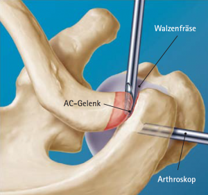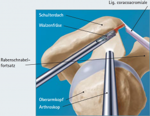 Therapie der Wahl ist die arthroskopische subacromiale Dekompression. Bei diesem arthroskopischen (geschlossenen) Eingriff erfolgt eine Vergrößerung des subacromialen Gleitraumes durch die Entfernung der entzündeten Weichteile unter dem Schulterdach (Entfernung des krankhaft veränderten Schleimbeutels, welcher wieder nachwächst) und die Entfernung der knöchernen Veränderungen des Schulterdaches mit Hilfe einer motorgetriebenen Präzisionsfräse (Abb. 21).