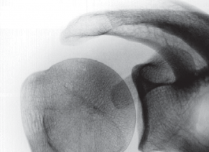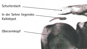 Die sog. Kalkschulter wird definiert als Kalkeinlagerung (Carbonatappatit) in die Sehnen der Rotatorenmanschette (Abb. 23), die durch unterschiedliche Faktoren ausgelöst sein kann. Am häufigsten ist davon die Supraspinatussehne betroffen. Die Erkrankung tritt häufig im 4. und 5. Lebensjahrzehnt auf und betrifft vorwiegend Frauen. Typischerweise finden sich wechselnde Phasen vollkommener Schmerzfreiheit und hochakuter Schmerzhaftigkeit.