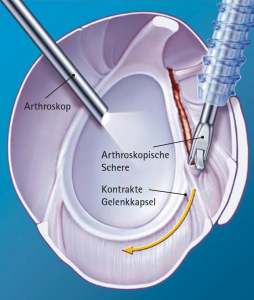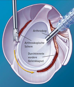 Gelenkkapsel arthroskopisch (geschlossen) gezielt durchtrennt werden (Abb. 25, 26). Zusätzlich wird die entzündete Gelenkschleimhaut entfernt.