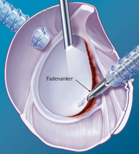 Auf arthroskopischem Weg kann man Bizepssehnenablösungen vom Ursprung wieder nähen (so genannter SLAP – Repair). Bei irreversiblen Schäden wird die Sehne am Ansatz durchtrennt und am Oberarmkopf arthroskopisch neu eingenäht (sog. Bizepssehnen – Tenodese) (Abb. 18). Beim älteren Patienten ohne Kraftanspruch reicht die alleinige Durchtrennung der kranken Bizepssehne (sog. Bizepssehnen – Tenotomie). Sie rutscht dann außerhalb des Gelenkes, verklemmt und vernarbt dort, es kommt zur Schmerzbefreiung.