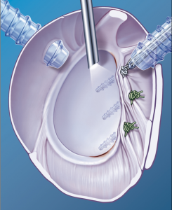 In diesem Bereich wird die Sehne mit einem Skalpell in Faserrichtung eingeschnitten. Hierbei kommt es bereits zu einer Entleerung des Kalkdepots.