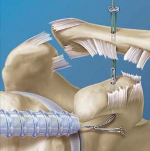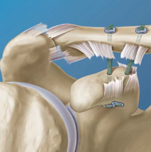 Im Rahmen von Verletzungen des Schultereckgelenkes (AC-Gelenk) kann es zur Beschädigung der stabilisierenden Strukturen kommen die für eine Sicherung des Schlüsselbeins nötig sind. Typische Unfallmechanismen sind der Sturz auf den angelegten Arm oder auf den ausgestreckten Arm mit fortgeleiteter Verletzung des Schultereckgelenkes. Je nach schwere des Unfalls unterscheidet man zwischen einer kompletten und inkompletten AC-Gelenkssprengung. Inkomplette können sehr gut konservativ behandelt werden. Bei kompletten Rupturen des stabilisierenden Bandapparats empfiehlt sich die operative Versorgung. Hierbei wird das Schlüsselbein arthroskopisch-assisiert am Rabenschnabel fixiert (Abb. 33).