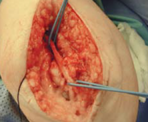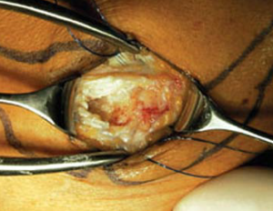 Hierbei wird in der von uns bevorzugten Technik nach Nirschl der krankhaft veränderte Anteil der Sehne des Musculus extensor carpi radialis brevis (ECRB) entfernt und der Knochen im Bereich des Epicondylus mehrfach angebohrt, so dass Blut heraustritt (Abb. 58). Durch die im Blut enthaltenen Zellen und Stoffe kommt es dann nach Naht der Sehnenansätze zu einer erneuten Heilung des Gewebes auf dem Epicondylus. Dieser Eingriff erfolgt in einer offenen Technik mit einem Hautschnitt von ca. 4 cm.