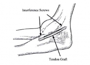 Bei chronischen Instabilitätszuständen ist eine direkte Naht der betroffenen Weichteile nicht mehr möglich und man muss Alternativverfahren wählen. Ähnlich der Ersatzplastik des vorderen Kreuzbandes am Kniegelenk mittels Semitendinosus-Sehne wird hierbei ein Transplantat aus der Palmaris-longus-Sehne oder ein Streifen aus der hinteren Trizepssehne entnommen. Diese Transplantate werden dann durch die ursprünglichen Ansatzpunkte am Ober- und Unterarm geführt und dort mittels Knochentunneln oder Nahtankern befestigt (Abb. 62, 63).